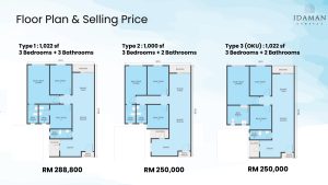  1000 sqft (3 bilik tidur, 2 bilik mandi) – RM250,000