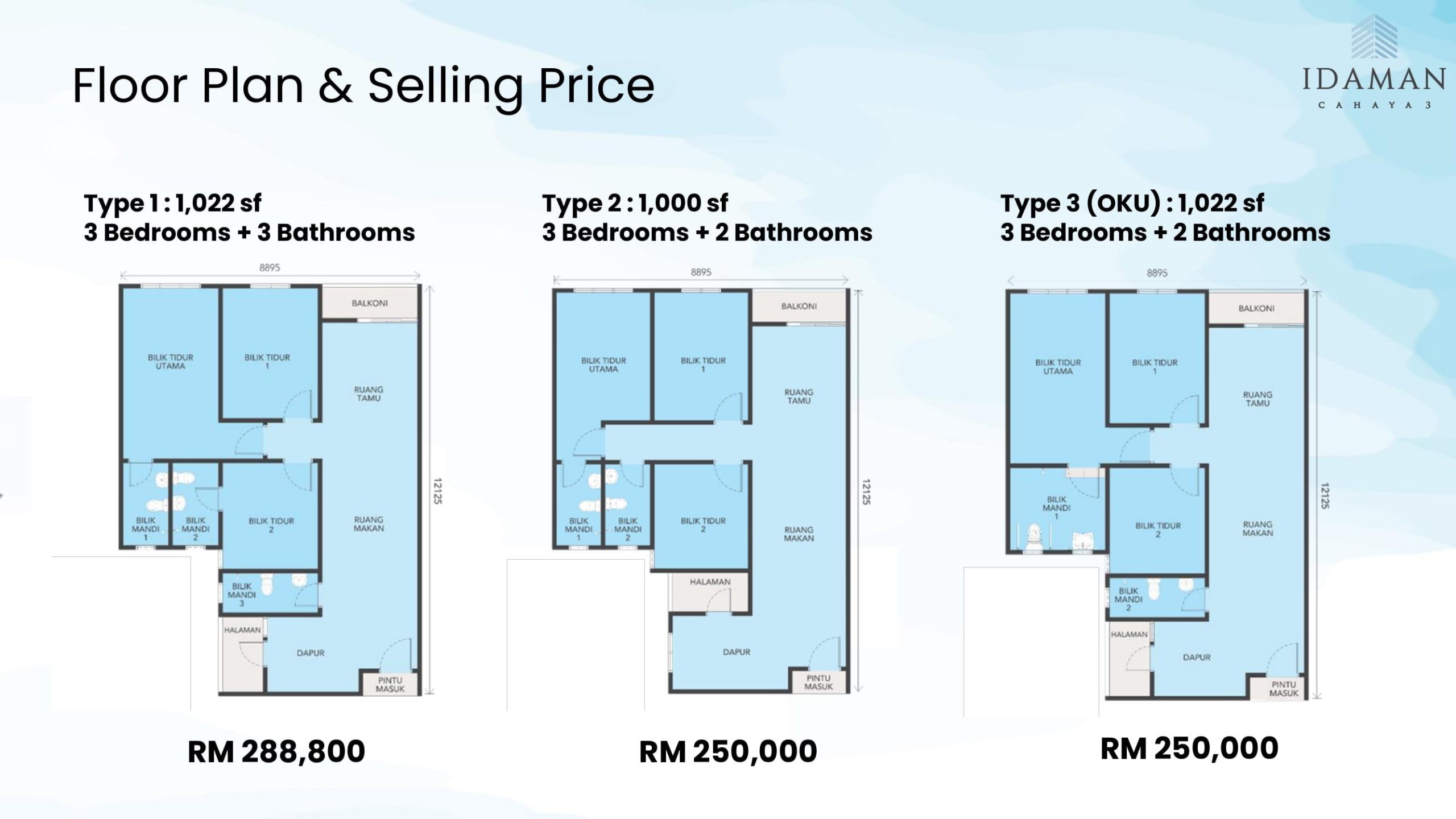  1000 sqft (3 bilik tidur, 2 bilik mandi) – RM250,000