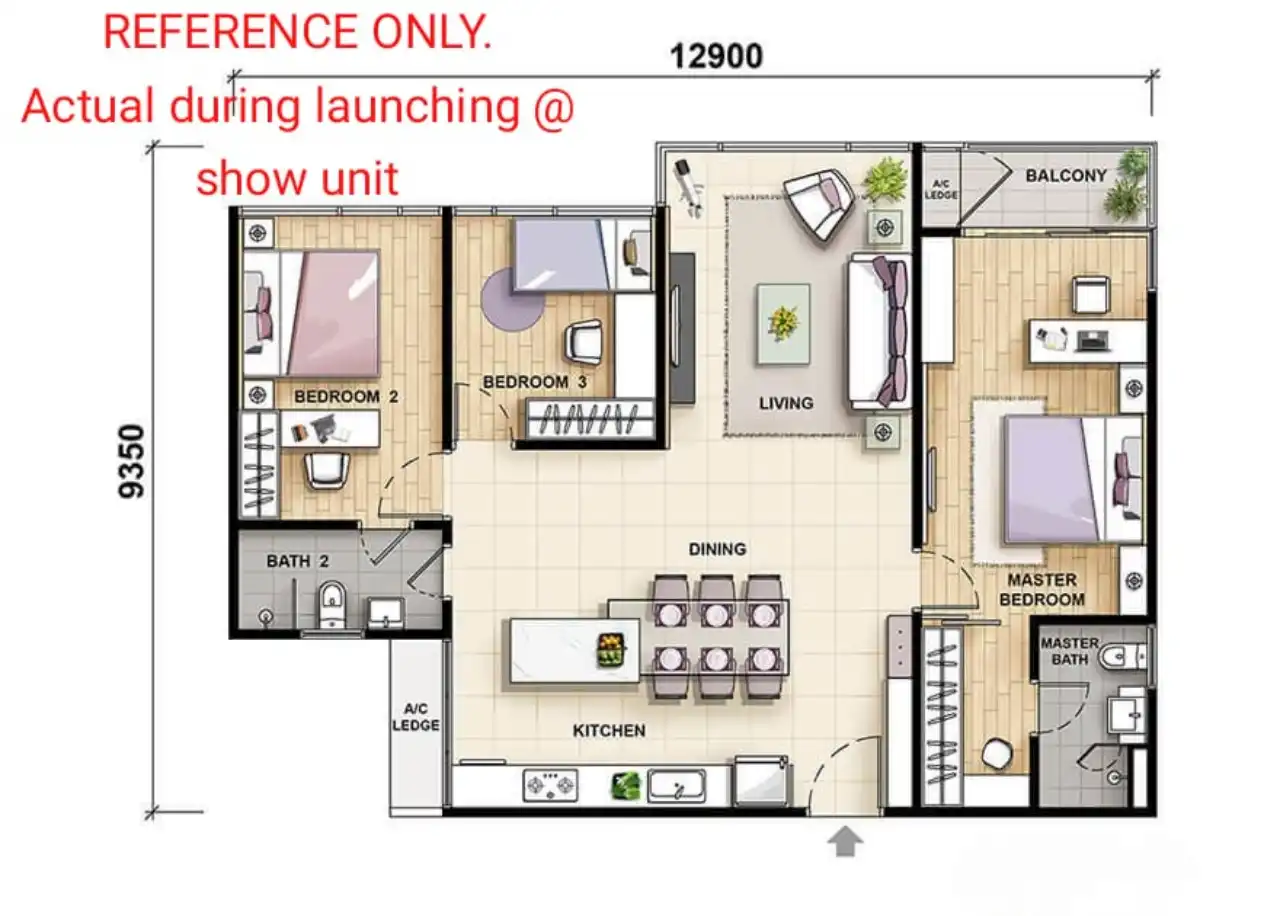 beli). Terdapat 2 jenis keluasan iaitu unit standard 1000sqft (3R2B) dan unit besar 1045sqft (4R3B).